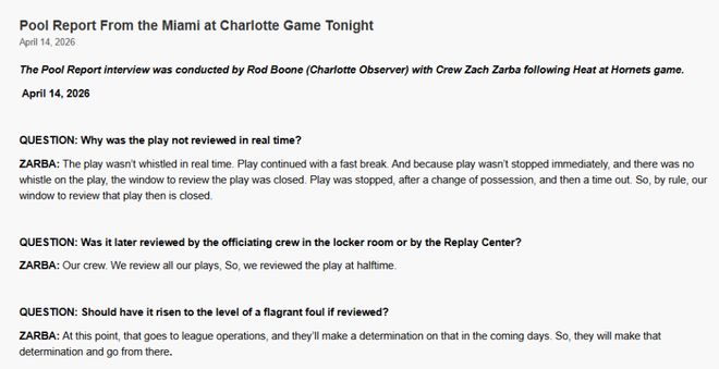 北京时间4月15日,黄蜂记者罗德-布恩在热火对阵黄蜂赛后对裁判组负责人扎尔巴进行采访,询问比赛中相关的争议回合。这个回合出现在第二节,当时拉梅洛-鲍尔(三球)拉到阿德巴约的脚踝,造成阿德巴约腰部受伤离场。裁判当时没有任何判罚,也没有回看。扎尔巴回应了相关的话题——