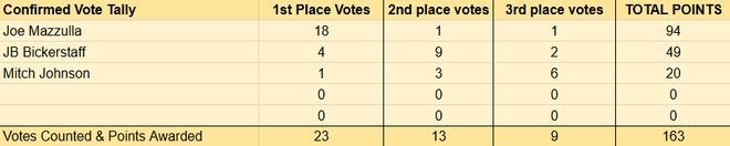 至于最佳教练,马祖拉的优势明显。已经揭晓的23位投票者,马祖拉得到18张第一选票,比克斯塔夫得到4张,米奇-约翰逊得到1张。虽然比克斯塔夫已经斩获教练协会颁发的最佳教练奖,但NBA官方的最佳教练奖预计属于马祖拉。