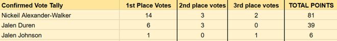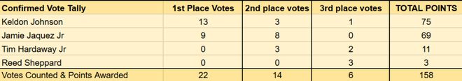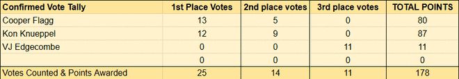 最佳第六人的竞争,预计会在凯尔登-约翰逊和小海梅-哈克斯之间进行。目前已公布的22人投票中,约翰逊拿到13张第一选票,哈克斯拿到9张第一选票,两人的票数折算分差只有6分。