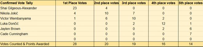 作为最重磅的奖项,常规赛MVP的归属悬念不大,已经揭晓的28位投票者,亚历山大得到23张第一选票,约基奇得到4张,文班亚马只有1张。亚历山大预计能蝉联这一奖项。