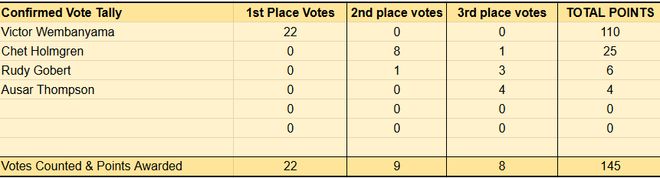 年度最佳防守球员:霍姆格伦、奥萨尔-汤普森、文班亚马