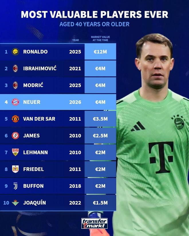 德转列史上40+岁球员身价榜:C罗1200万欧断层领先,伊布次席