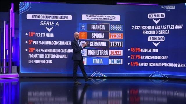 意大利从世预赛黯然出局后一周,欧冠八强战首回合打响,皇马和拜仁在伯纳乌上演了90分钟质量极高的比赛,让意大利人真实地看到了差距。几个小时后,意大利足协发布了一份关于意大利足球的发展报告,天空体育在周三晚间的节目中以此为基础,进行了一次精彩的技术分析,试图用图表和数据“诊断”意大利足球的病因。