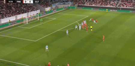 第10分钟,曼赞比横传,格里福兜射破门先拔头筹,弗赖堡1-0塞尔塔