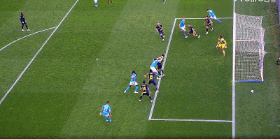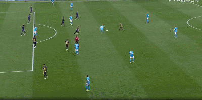 第14分钟,德布劳内头球攻门,皮球被挡出