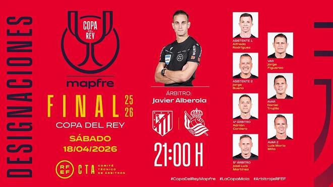 西班牙足协发布的公告宣布,哈维尔-阿尔韦罗拉将会担任国王杯决赛的主裁,两位边裁为阿尔弗雷多-罗德里格斯和豪尔赫-布埃诺,阿德里安-科尔德罗、何塞-路易斯-马丁内斯担任第四和第五官员。VAR为豪尔赫-菲格罗亚,AVAR为丹尼尔-特鲁希略。