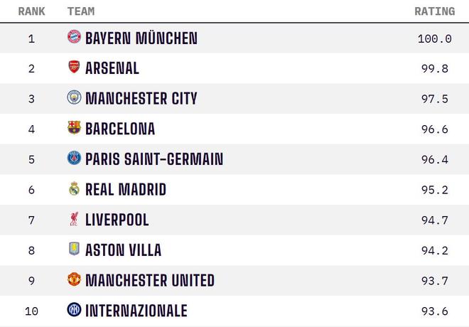 OPTA全球俱乐部实力榜:拜仁居首阿森纳次席,前十英超占5席