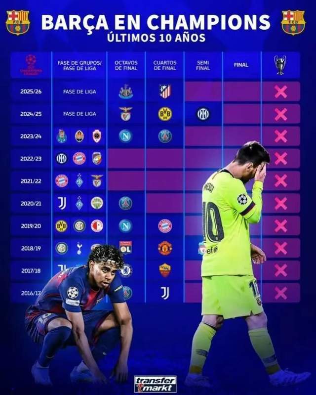 更扎心的不是巴萨已经11年没能拿到欧冠冠军了,而是在这11年中,巴萨死敌皇马拿到了5次欧冠冠军。另外,在欧冠道路上,马竞也成了巴萨名副其实的苦主,在巴萨与马竞的三次交手中,巴萨均不敌对手惨遭淘汰。除了马竞,在过去的11次欧冠比赛中,巴萨还2次输给了巴黎。