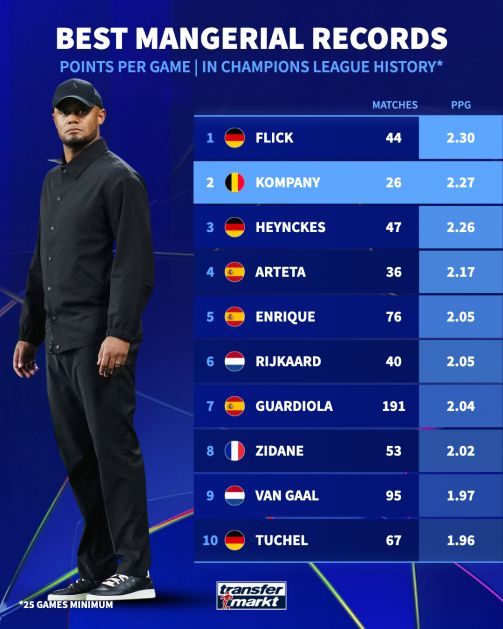 这场胜利也意味着,孔帕尼现在欧冠场均拿到2.27分,在所有欧冠教练中排名历史第二——仅次于前拜仁主帅弗利克(2.3分)。