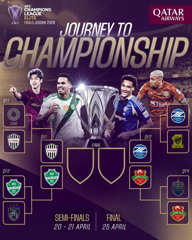 亚冠精英联赛四强对阵:神户vs吉达国民,町田vs迪拜青年国民